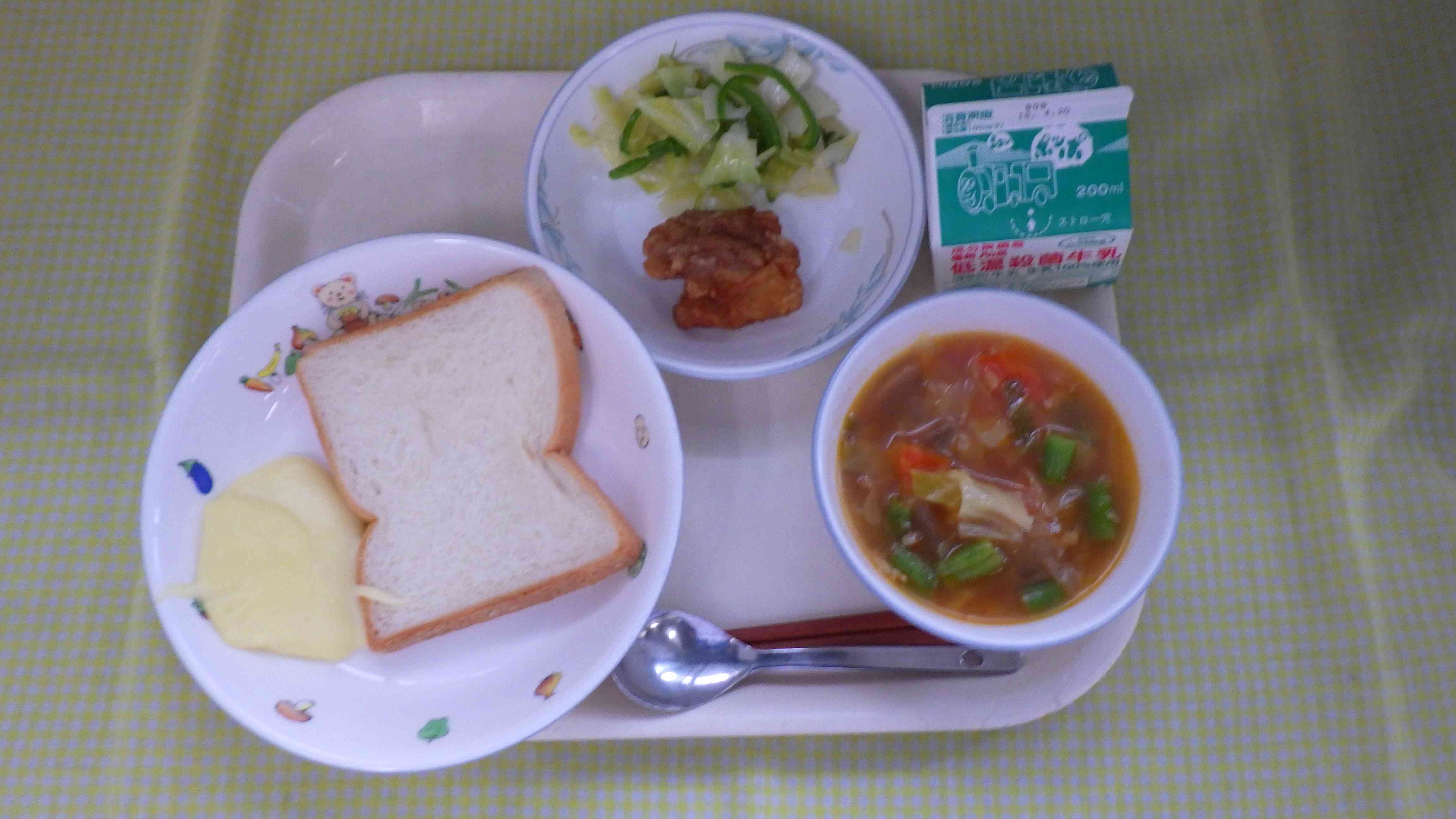 食パン カスタードクリーム トマトスープ 鶏のから揚げレモンソース キャベツソテー 牛乳