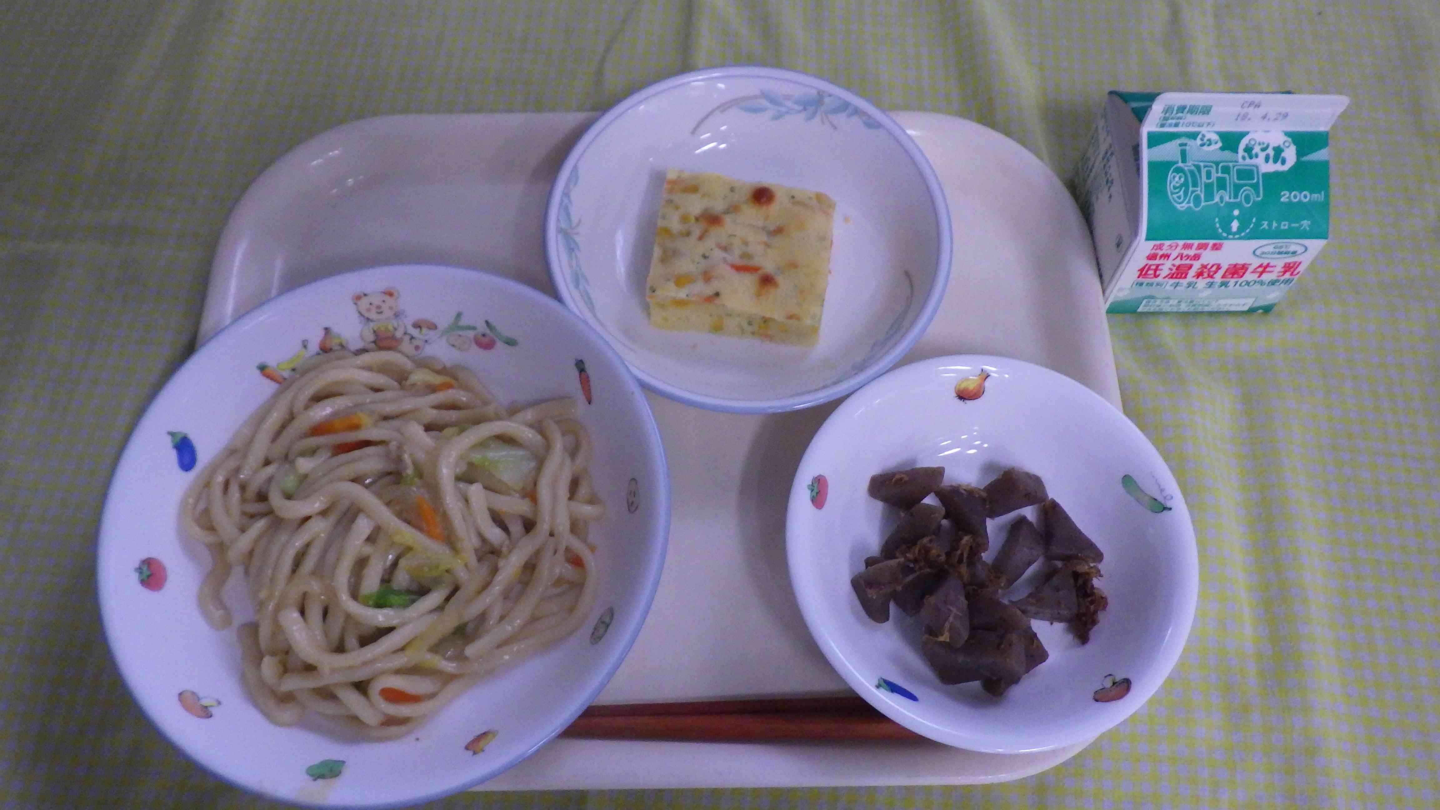 炒めうどん こんにゃくのおかか炒め コーンケーキ 牛乳