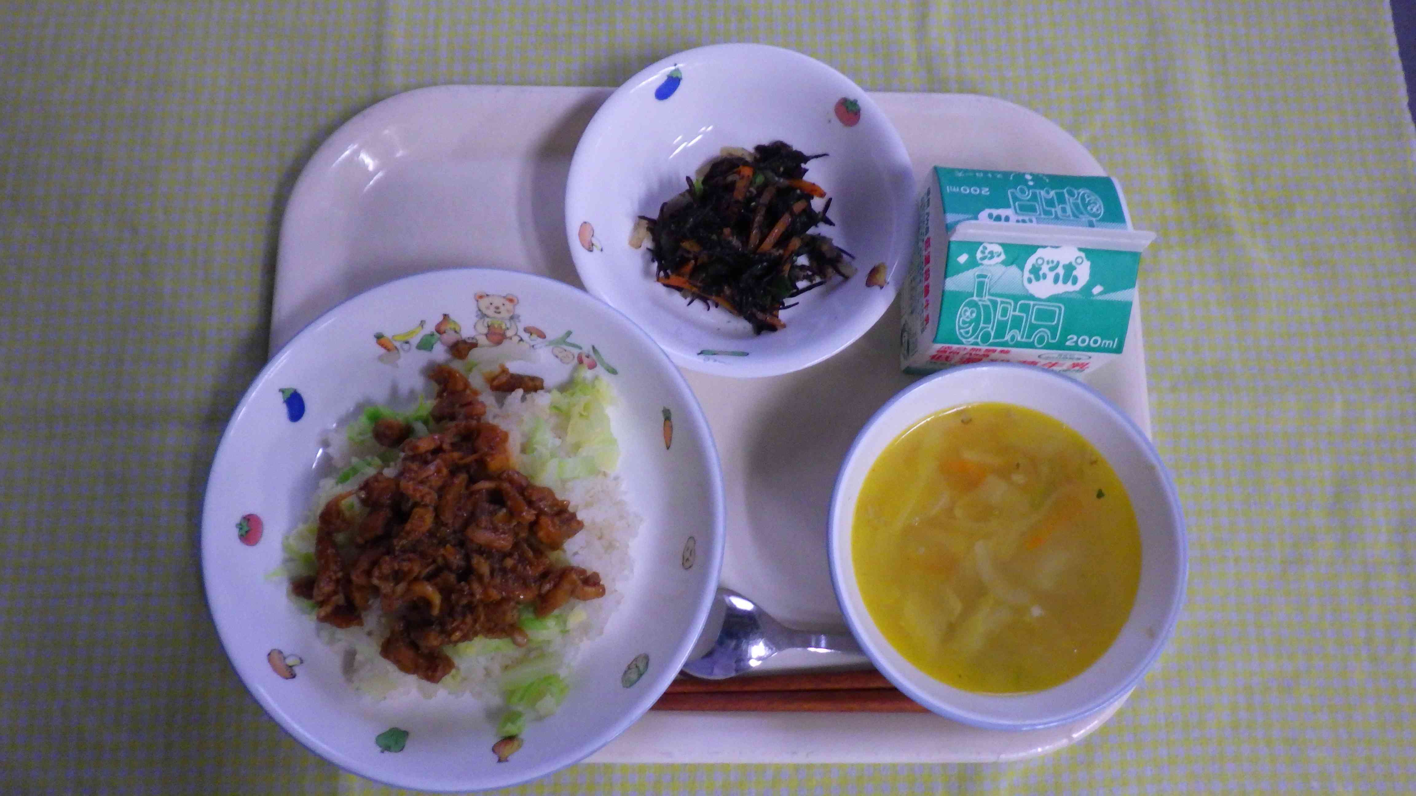 鶏肉のケバブ丼 コンソメスープ ひじきの炒め物 牛乳