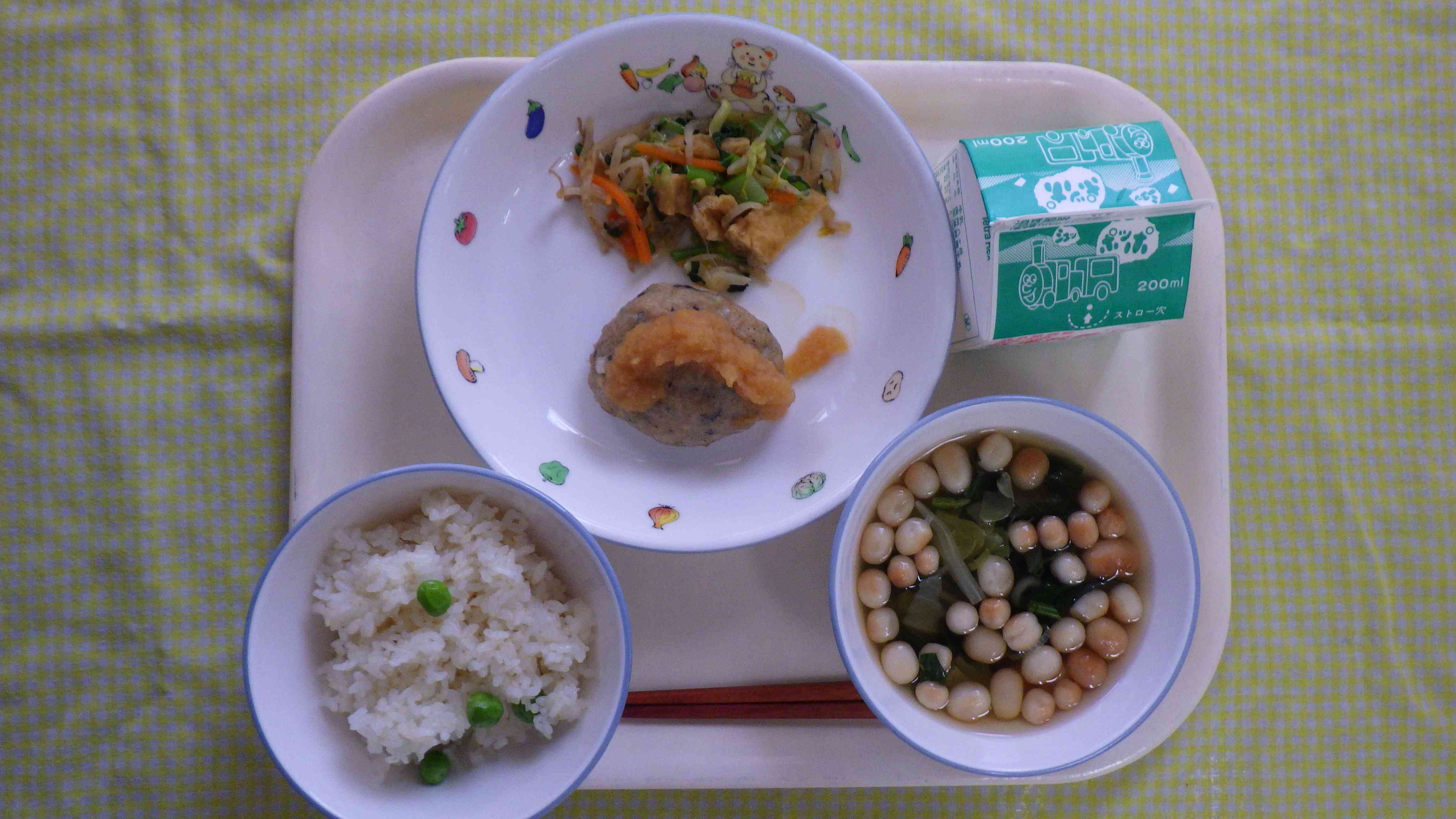 グリーンピースごはん すまし汁 つくね焼きおろしソース 温野菜 牛乳
