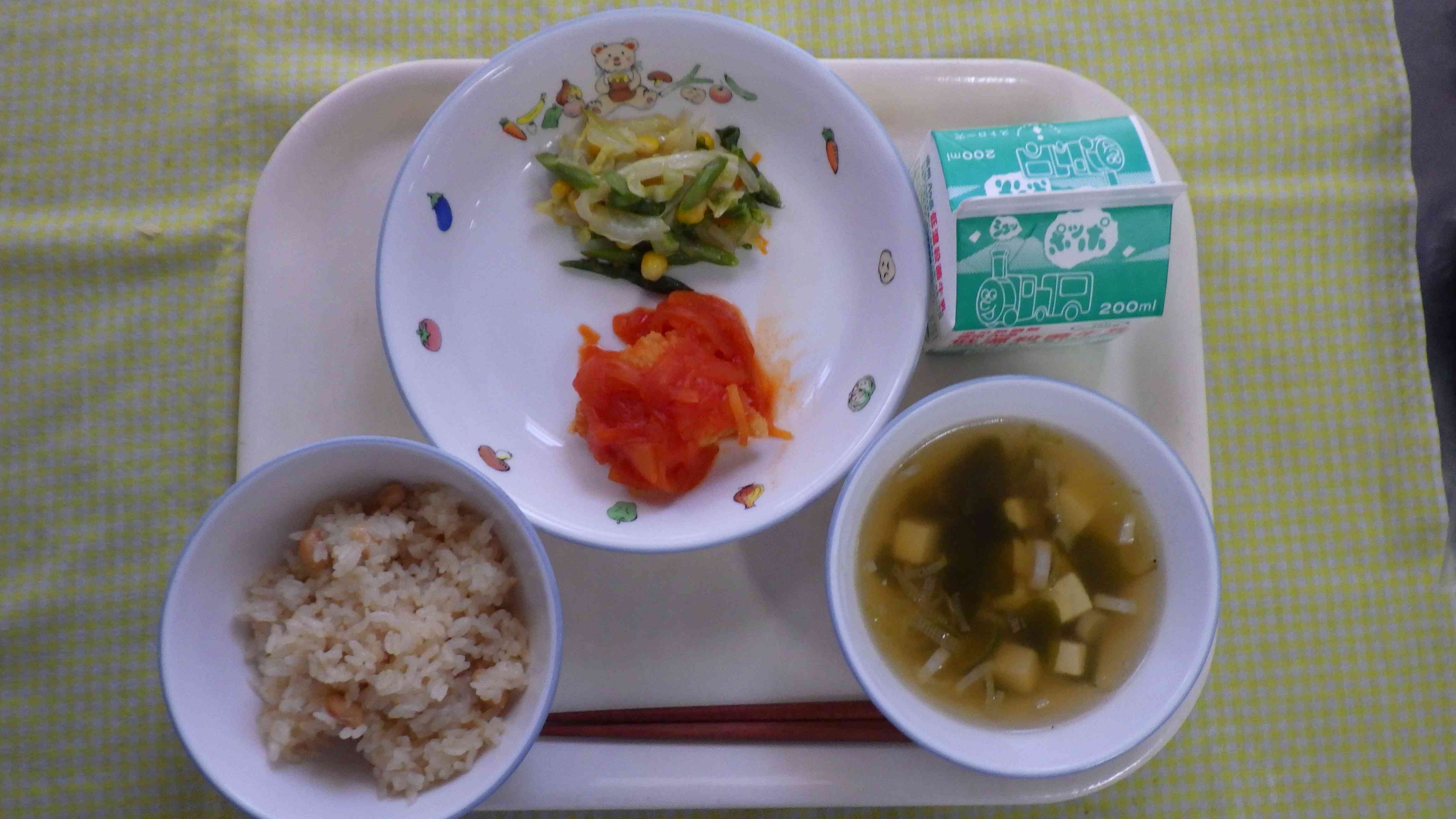 大豆ごはん わかめスープ いかのチリソース アスパラソテー 牛乳