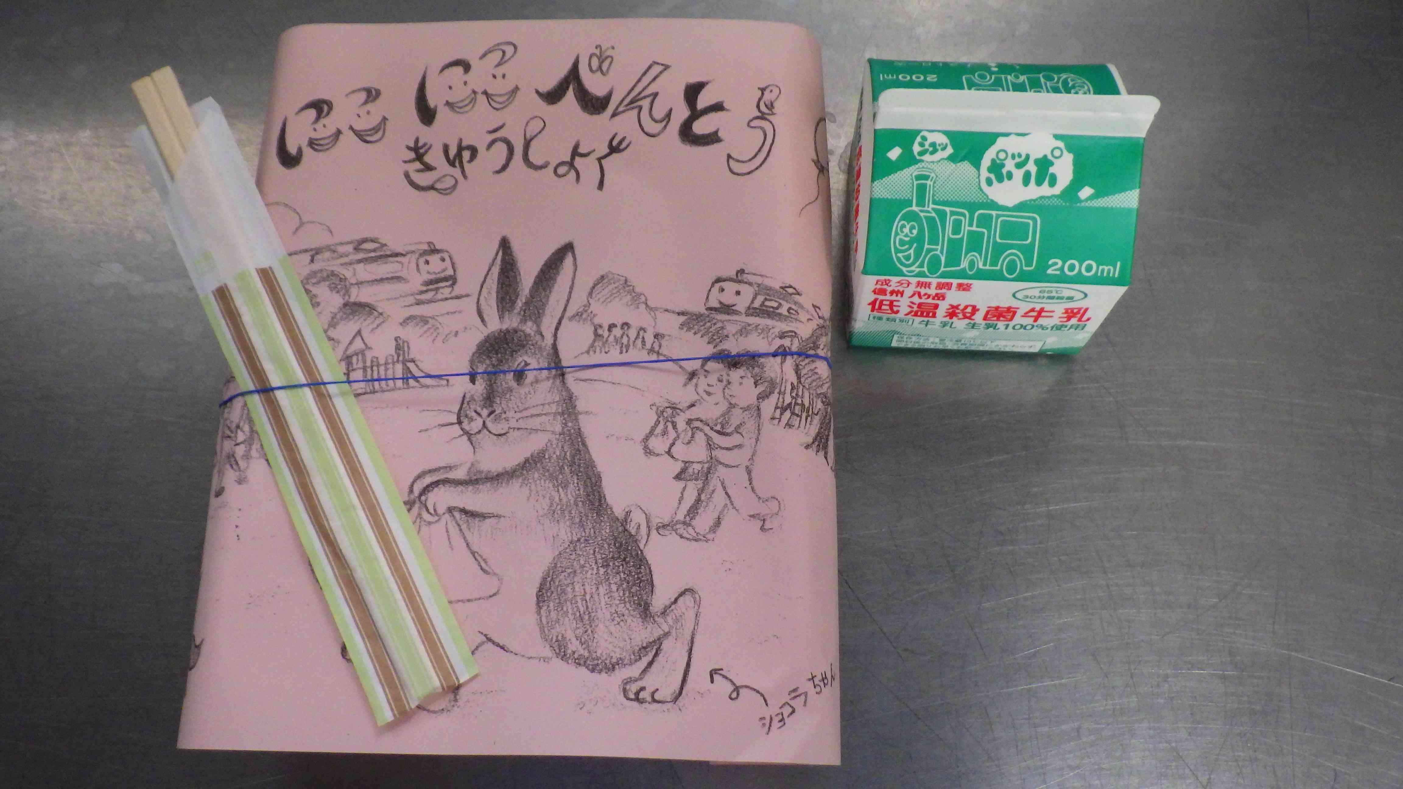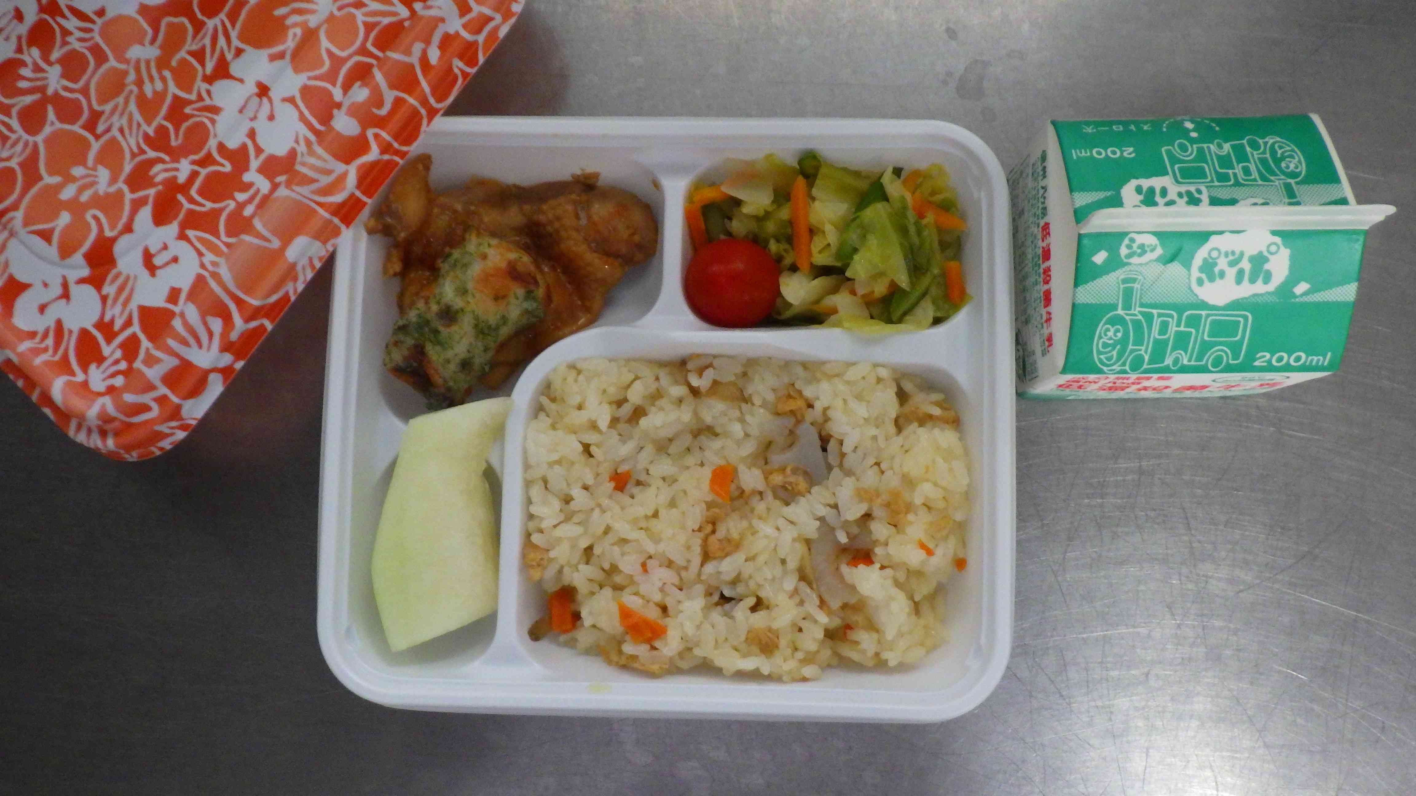 ★にこにこ給食★ 炊き込みちらし寿司 鶏のコリアン風 ちくわの磯辺揚げ アスパラソテー ミニトマト メロン 牛乳