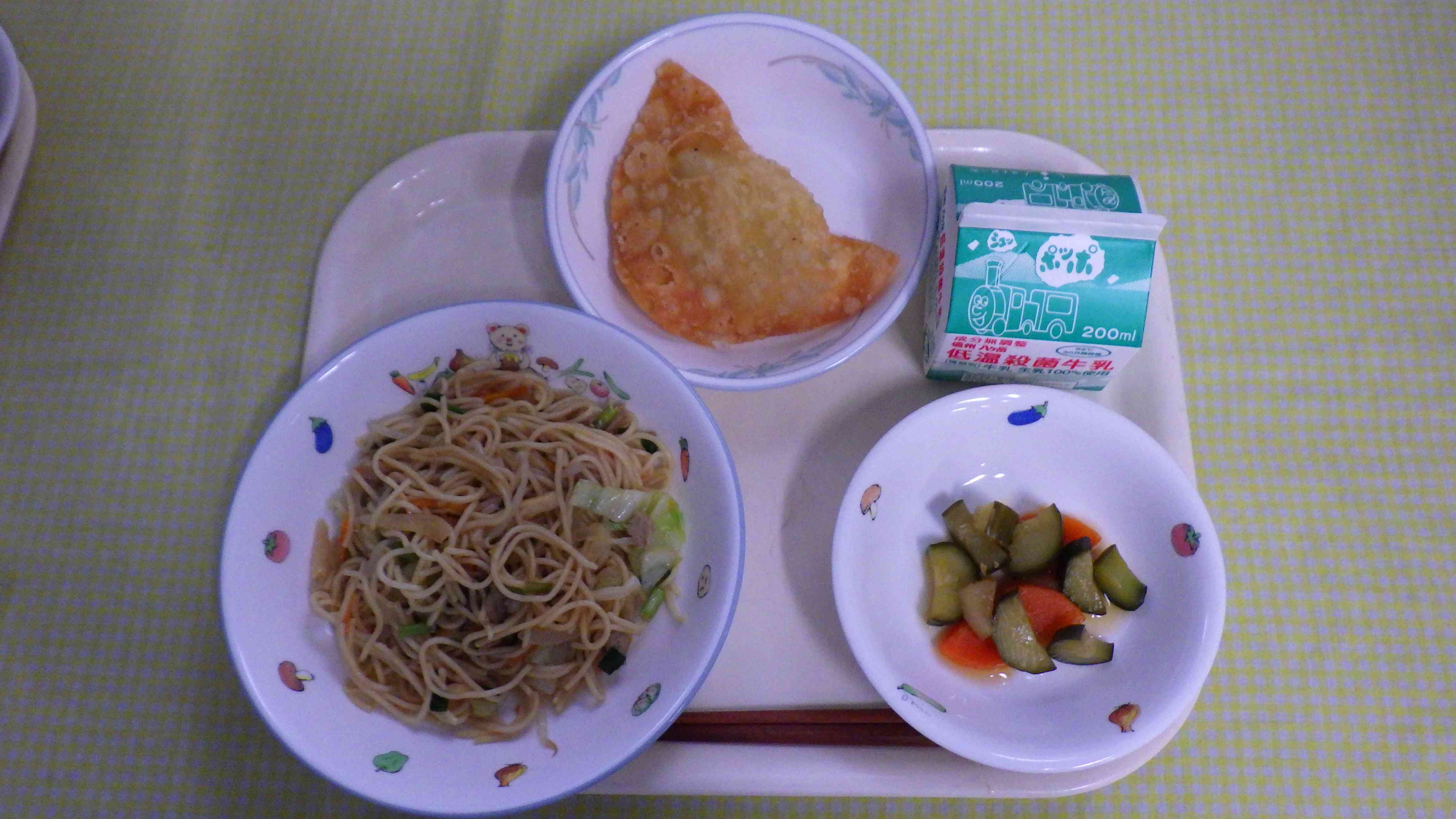 炒め焼きそば インドサモサ 和風ピクルス 牛乳