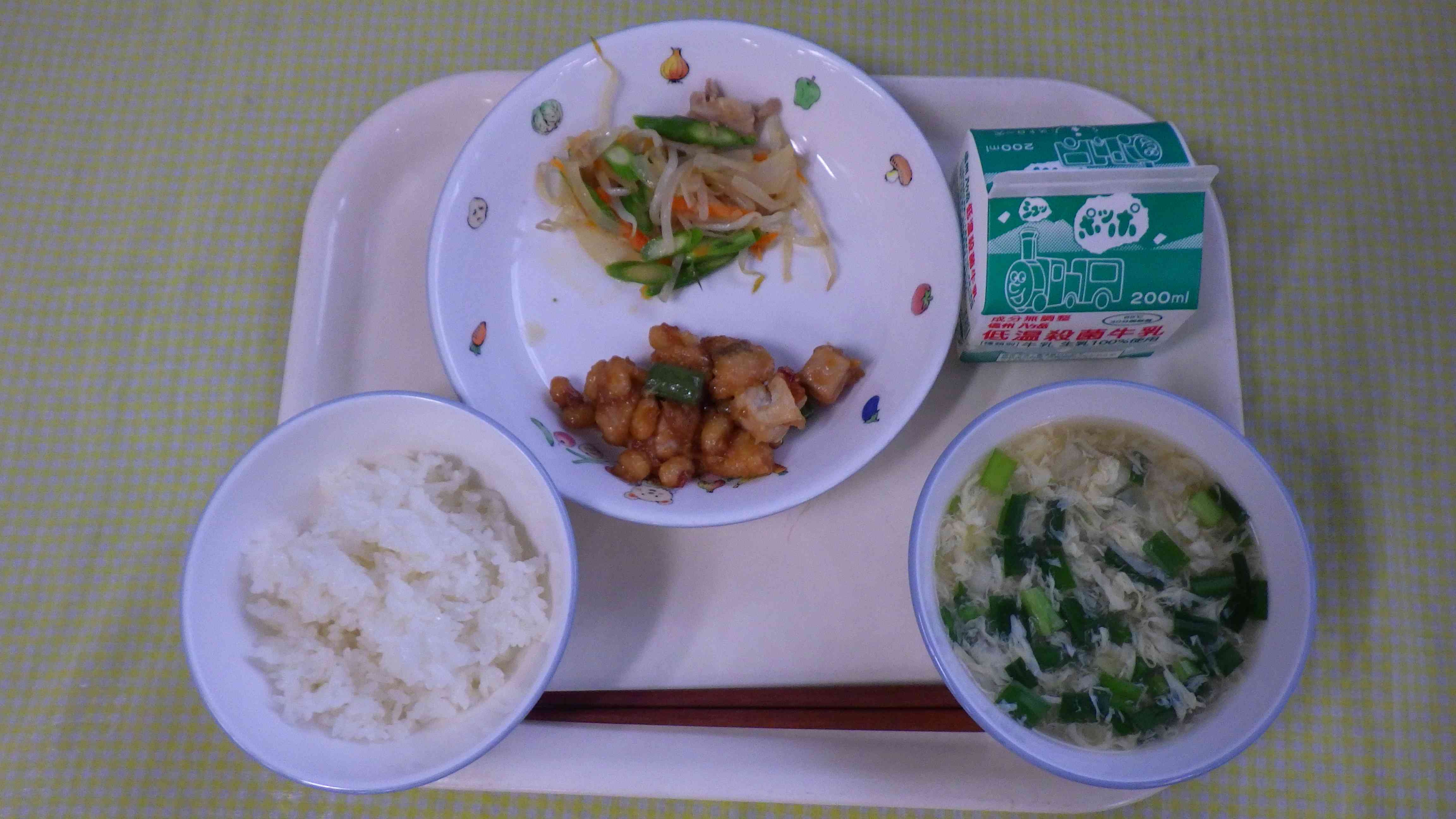 ごはん にら玉汁 まぐろと大豆のこはく煮 アスパラと豚肉の炒め物 牛乳