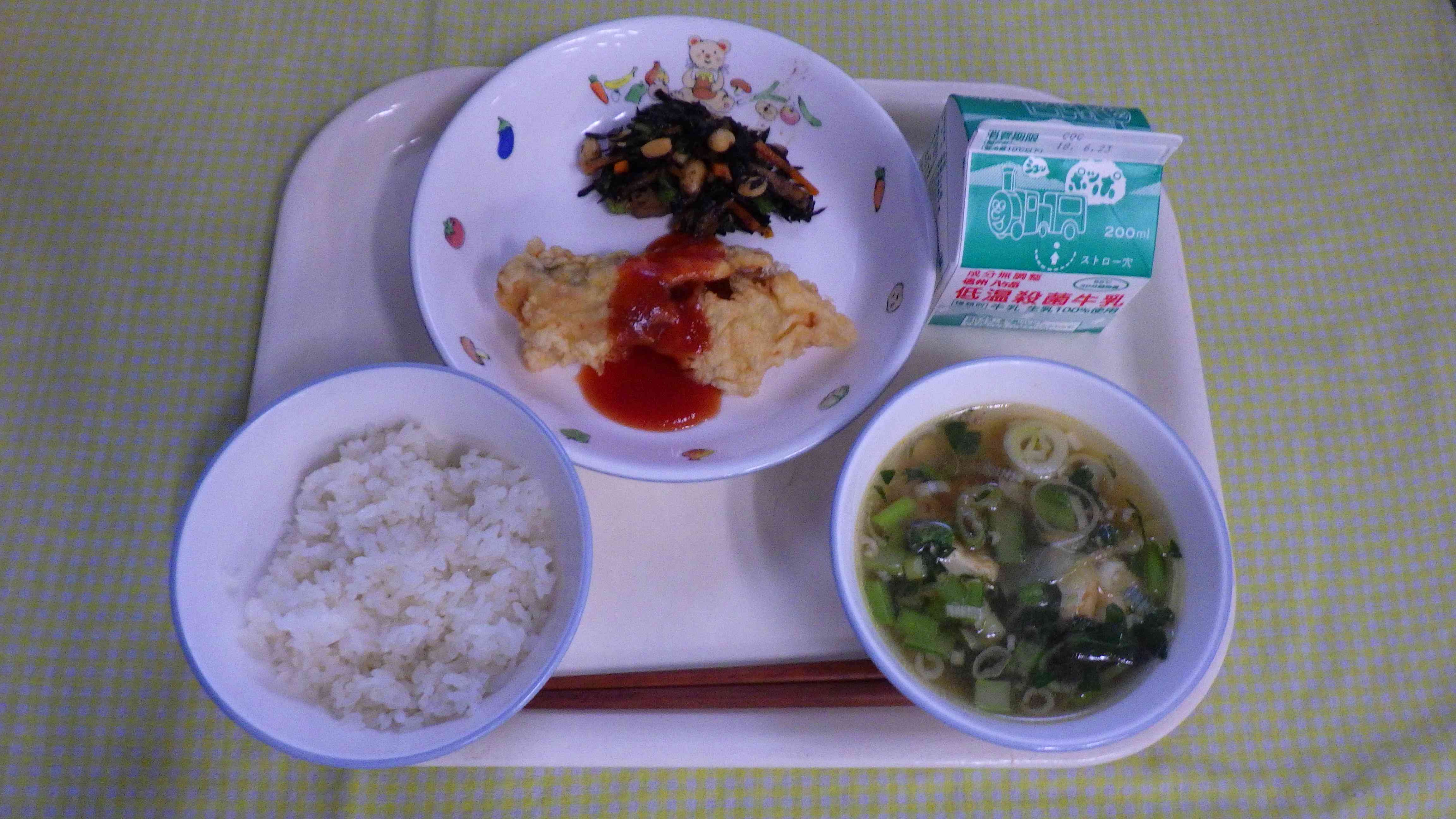 ごはん 実だくさん汁 メルルーサ甘酢あんかけ ひじきと大豆の煮物 牛乳