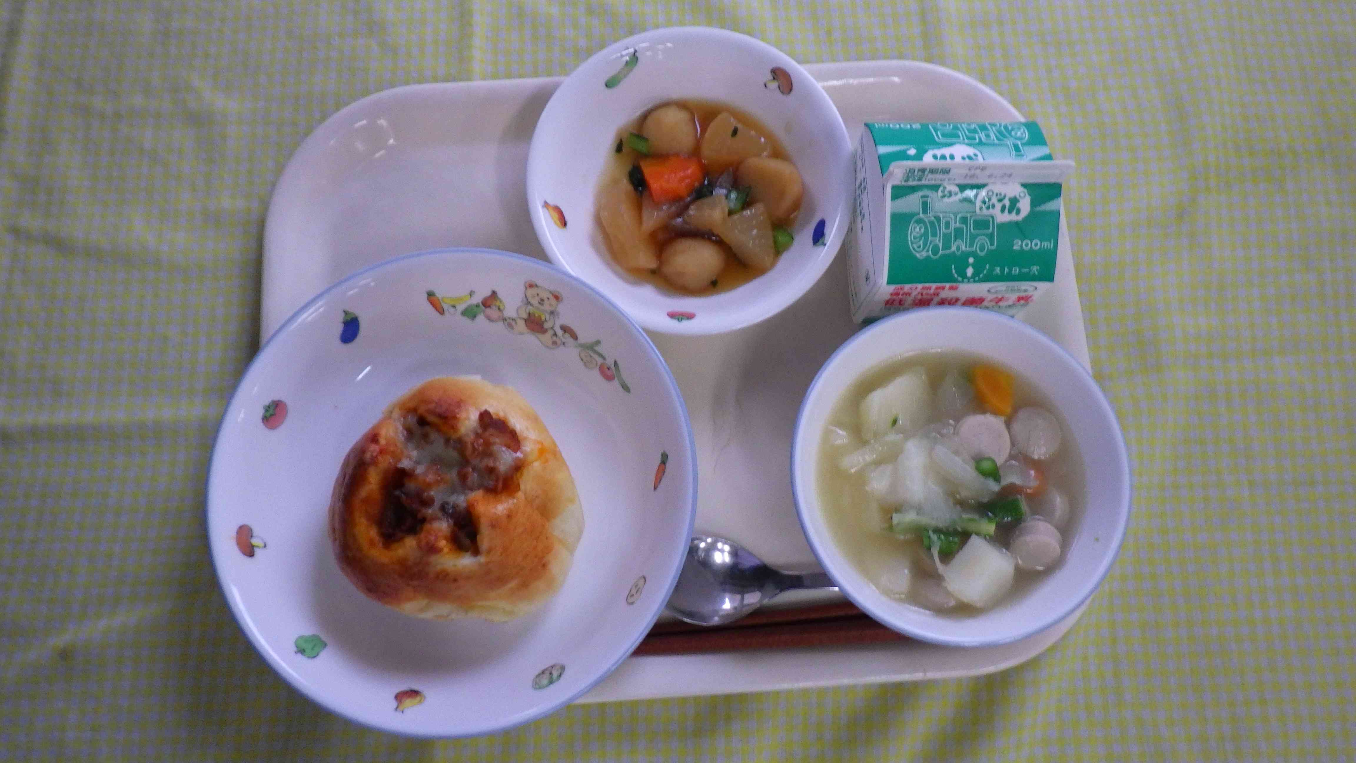 手作りピザパン ウインナーポトフ 揚げボールの煮物 牛乳