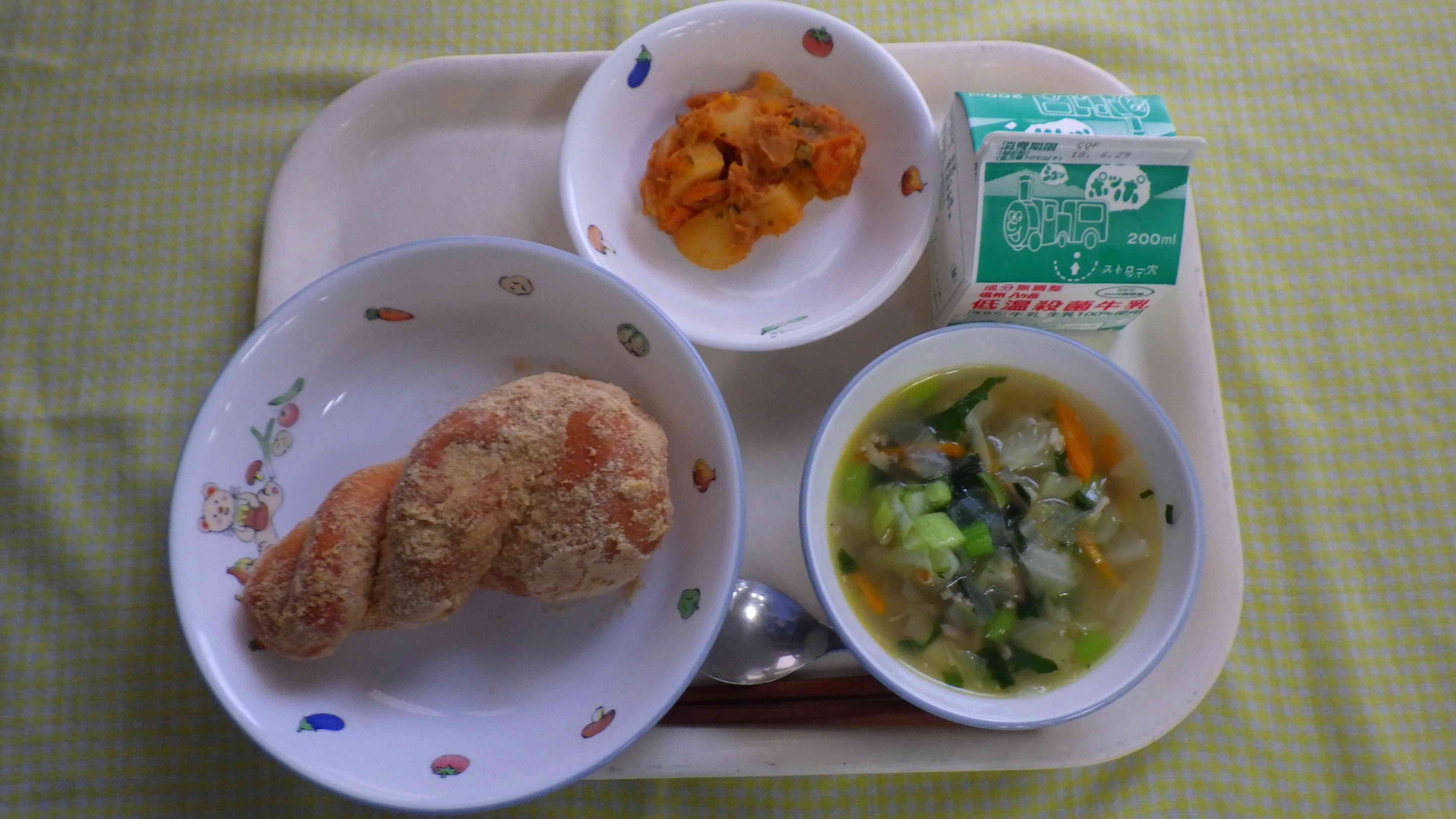 きな粉揚げパン イタリアンスープ じゃが芋とツナのトマト煮 牛乳