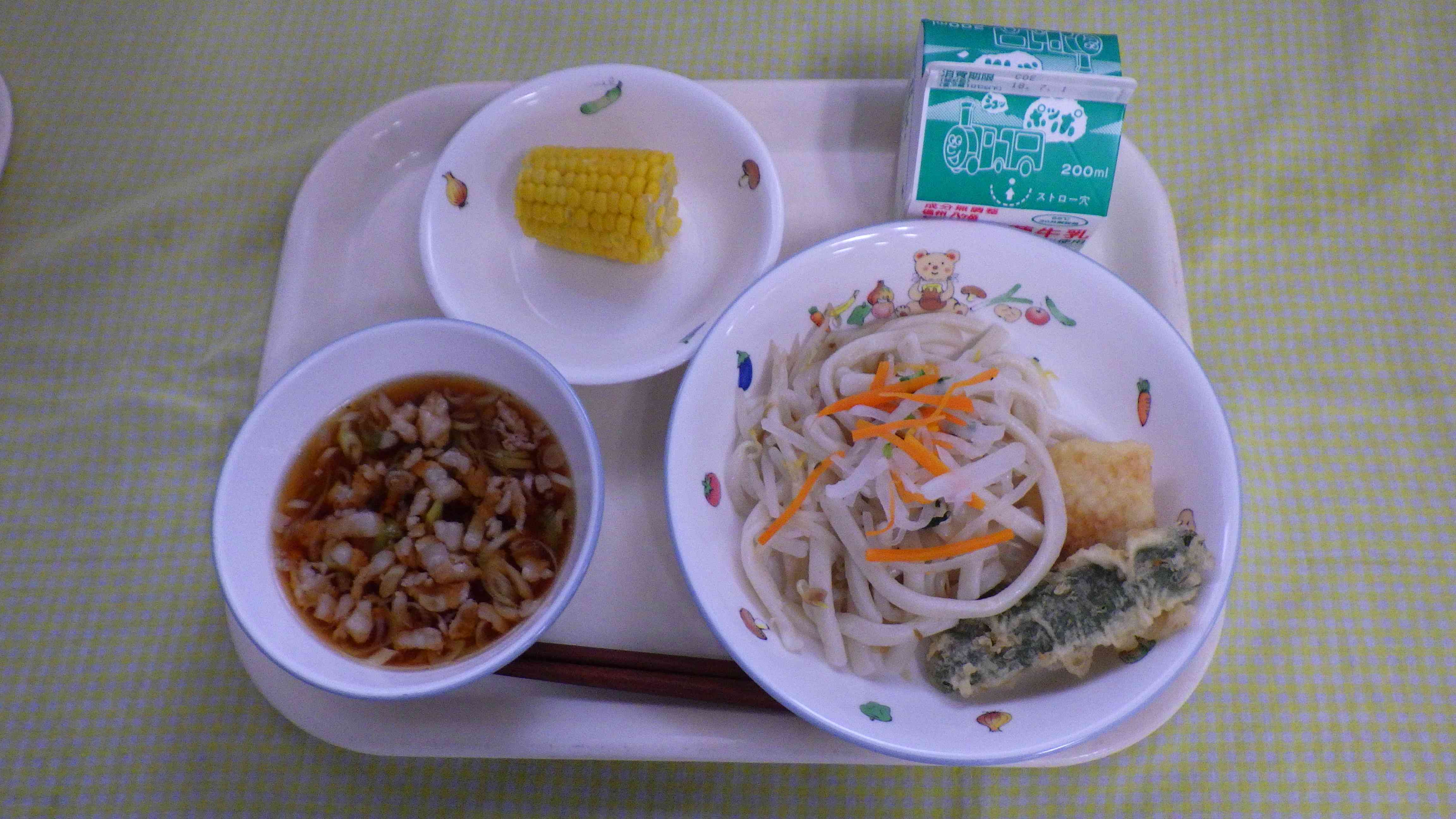 武蔵野糧うどん いかとピーマンの天ぷら とうもろこし 牛乳