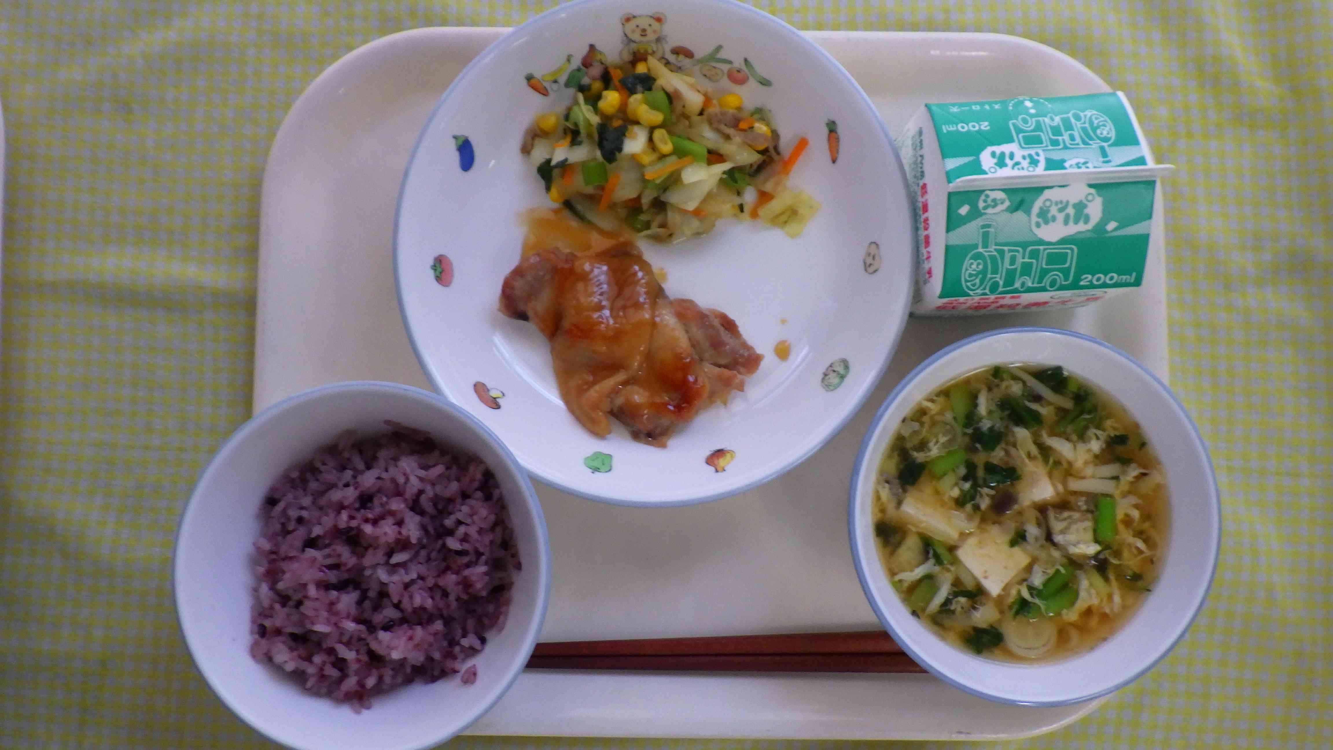 黒米ごはん たけのこのみそ汁 鶏の照り焼き カレーソテー 牛乳