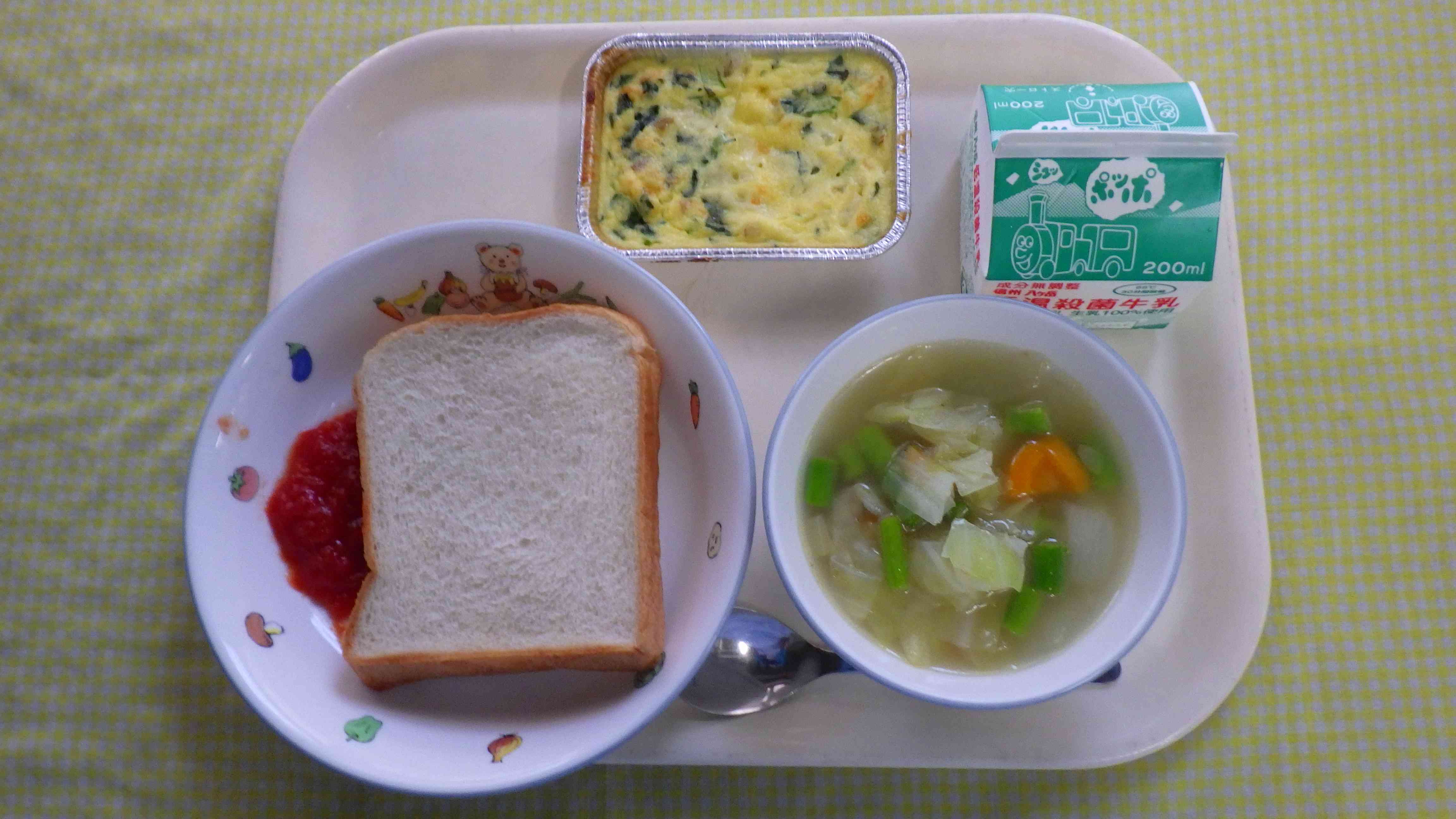 食パン ひみつのジャム(トマトジャム) ポトフ おからのキッシュ 牛乳
