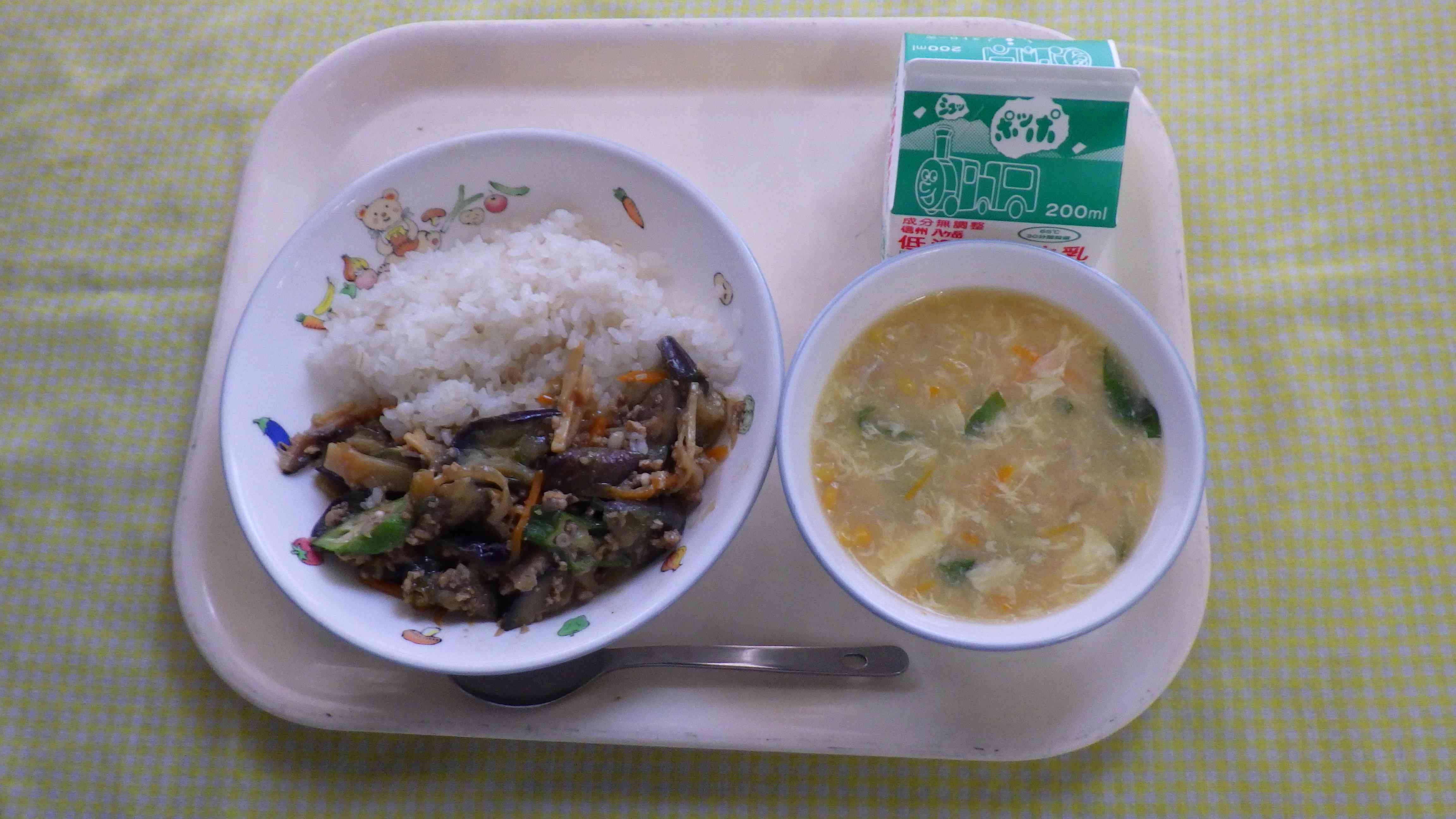 マーボーなす丼 卵とコーンのスープ 牛乳