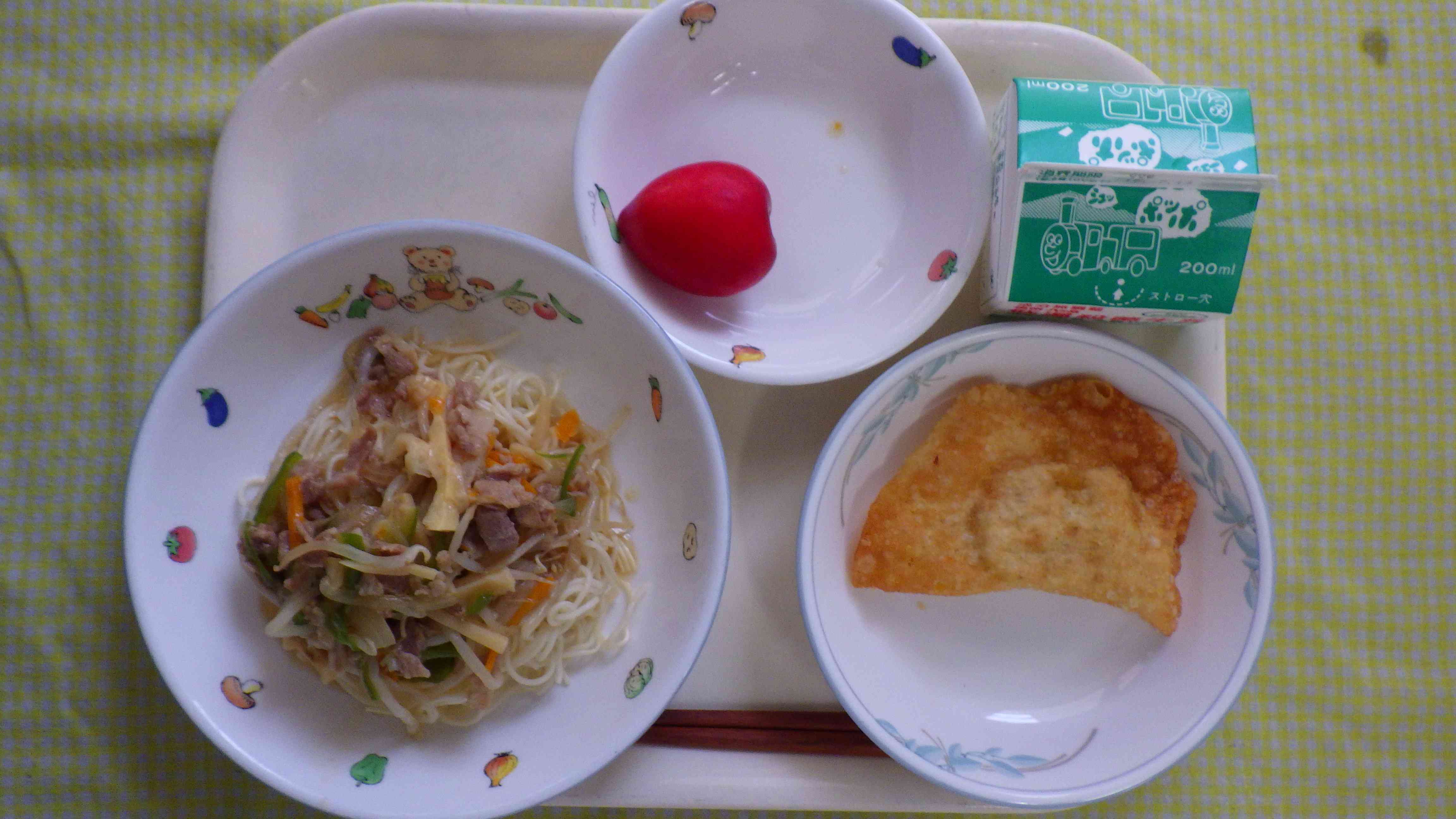 焼きそばチンジャオロースー かぼちゃとチーズの包み揚げ プラム 牛乳