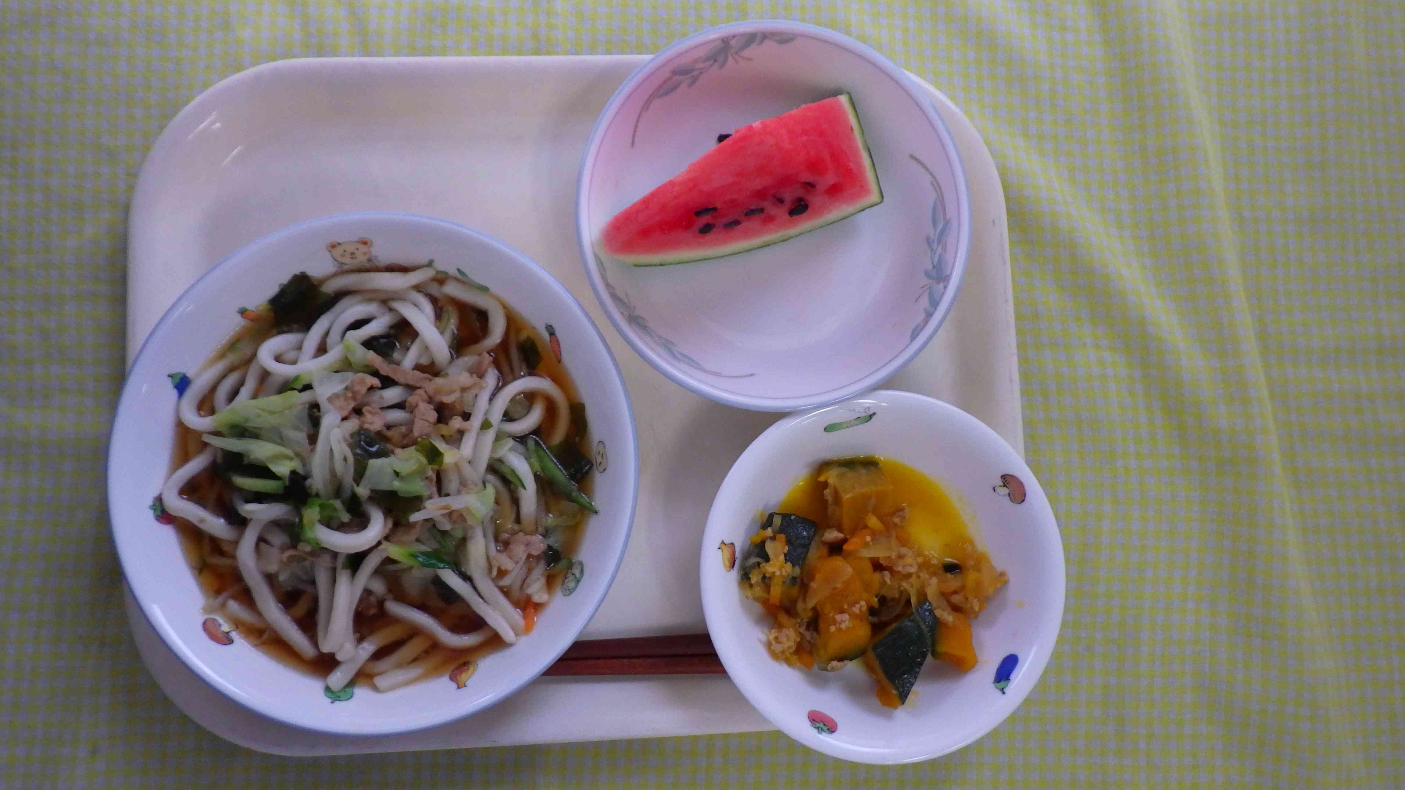冷やしサラダうどん かぼちゃのそぼろ煮 すいか 牛乳
