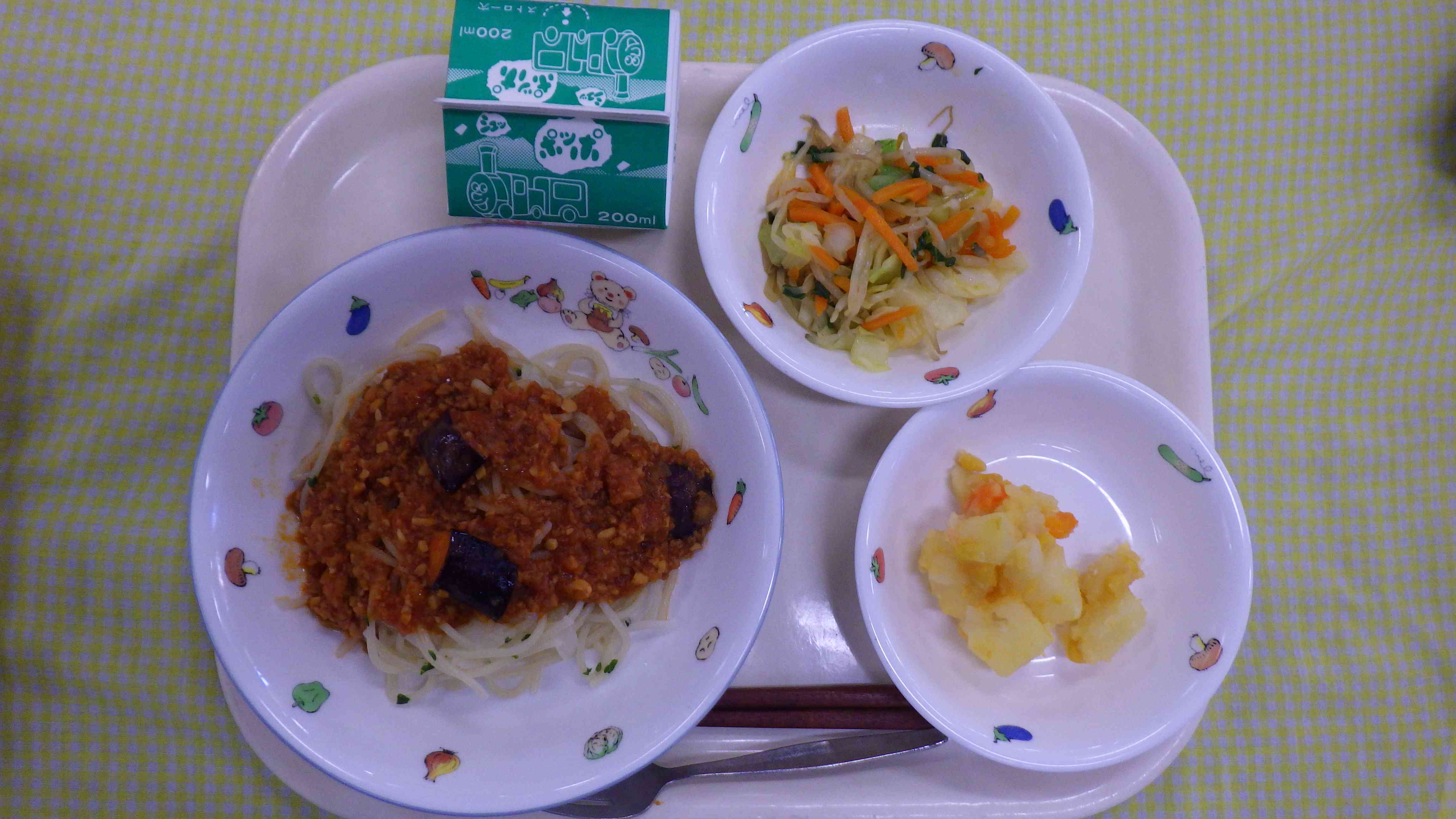 なすのスパゲティミートソース 三色煮 あっさり野菜 牛乳