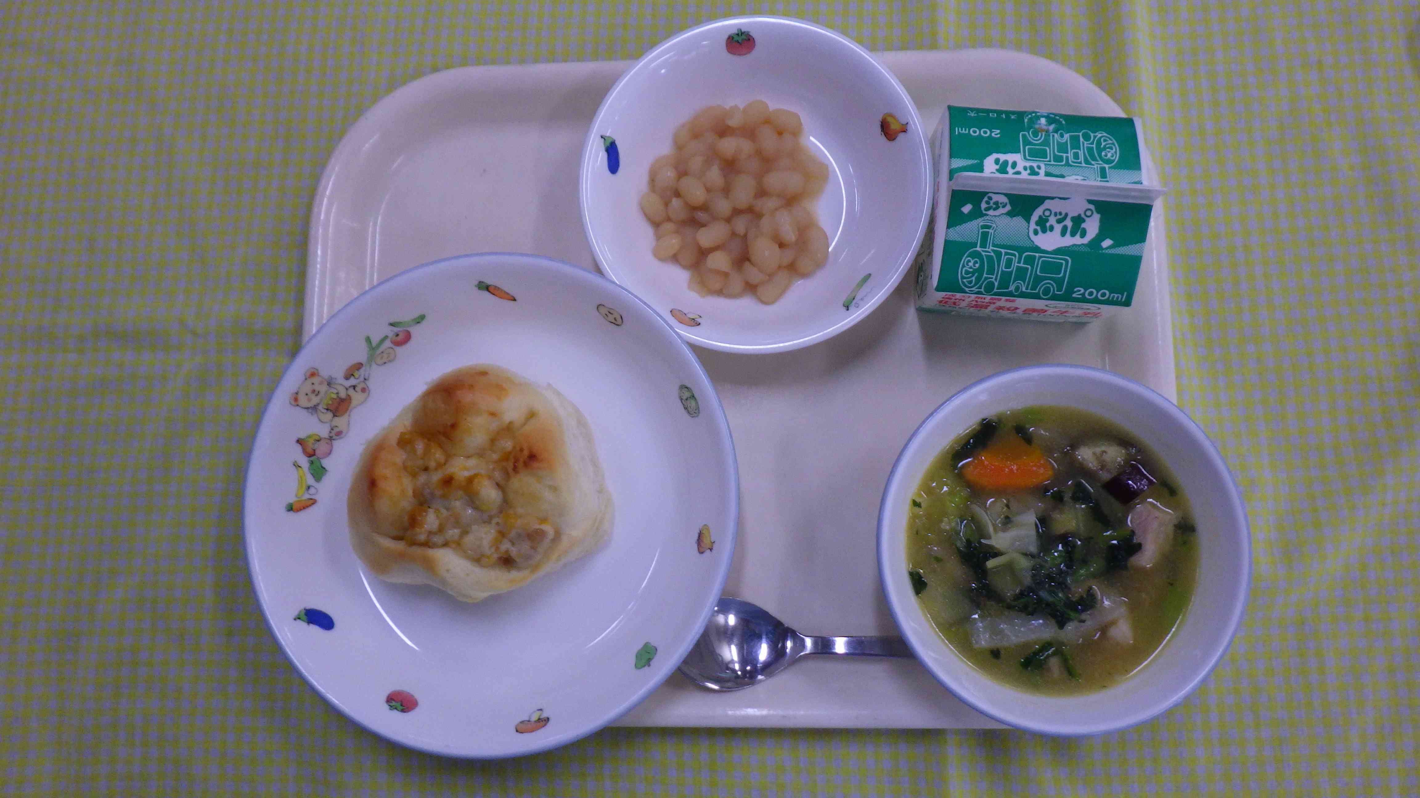手作りコーンパン 秋野菜のポトフ 白インゲン豆の甘煮 牛乳