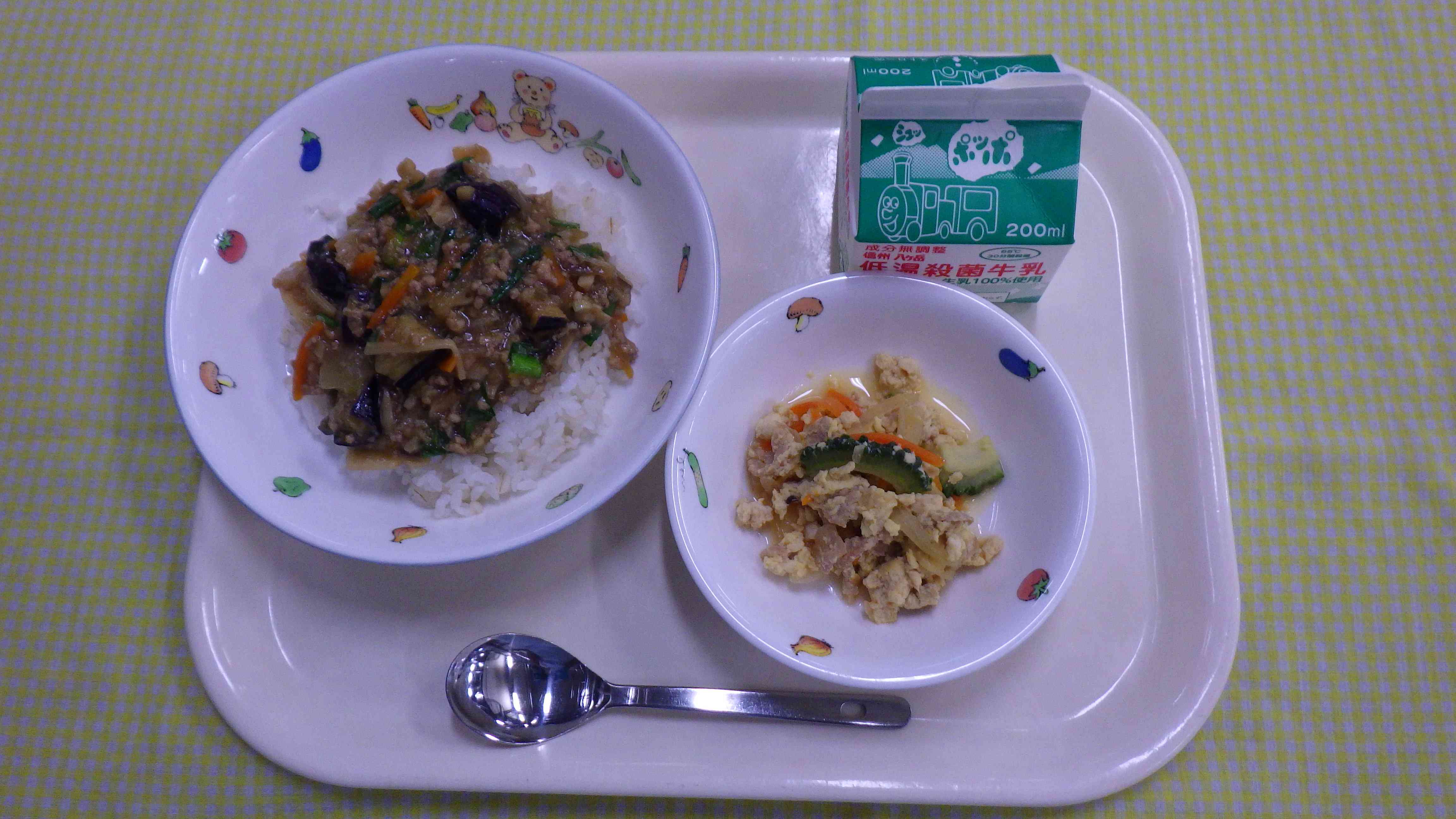 マーボーなす丼 ゴーヤチャンプル 牛乳