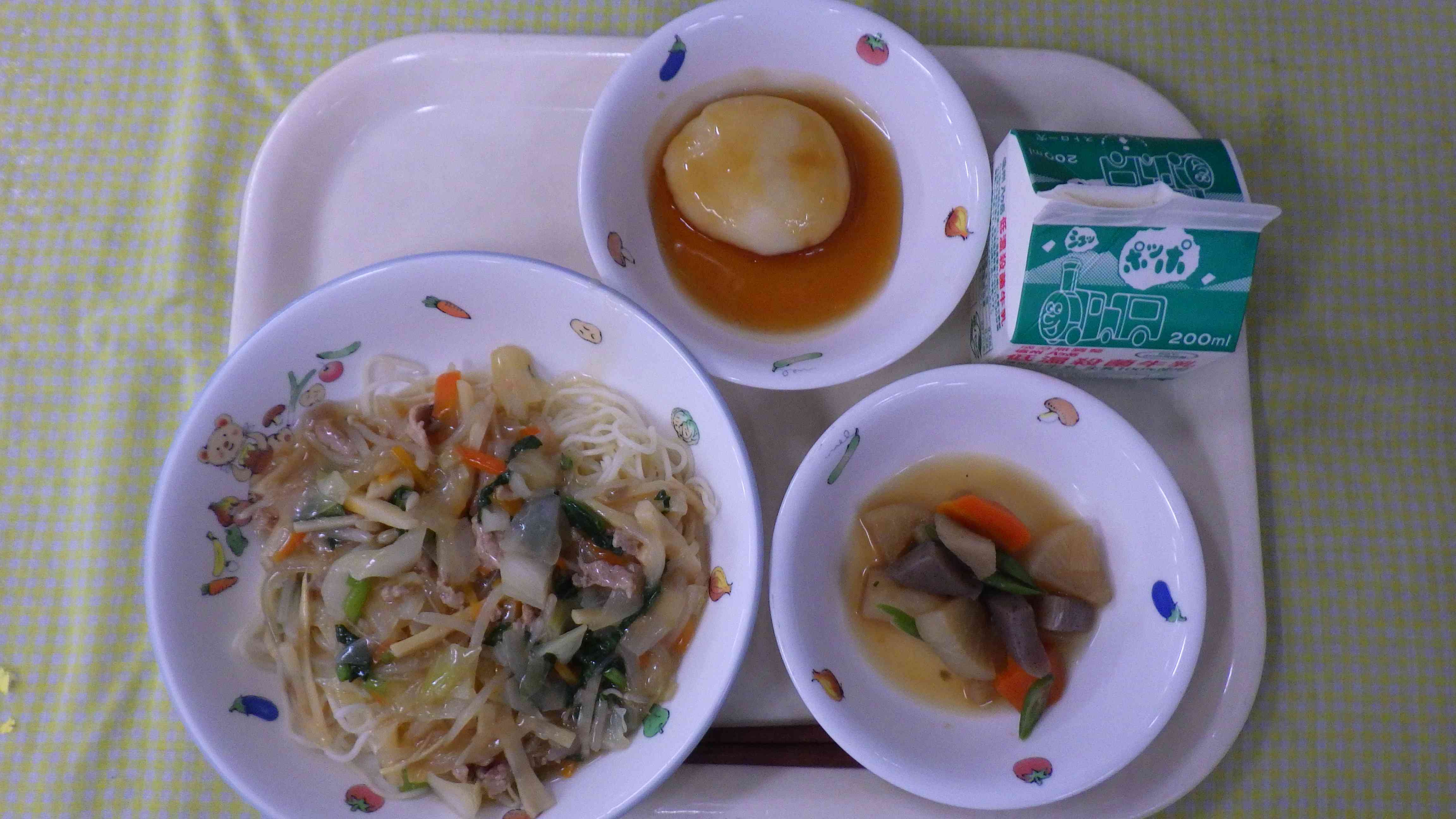 焼きそば五目あんかけ 根菜とさつま揚げの煮物 お月見だんご 牛乳